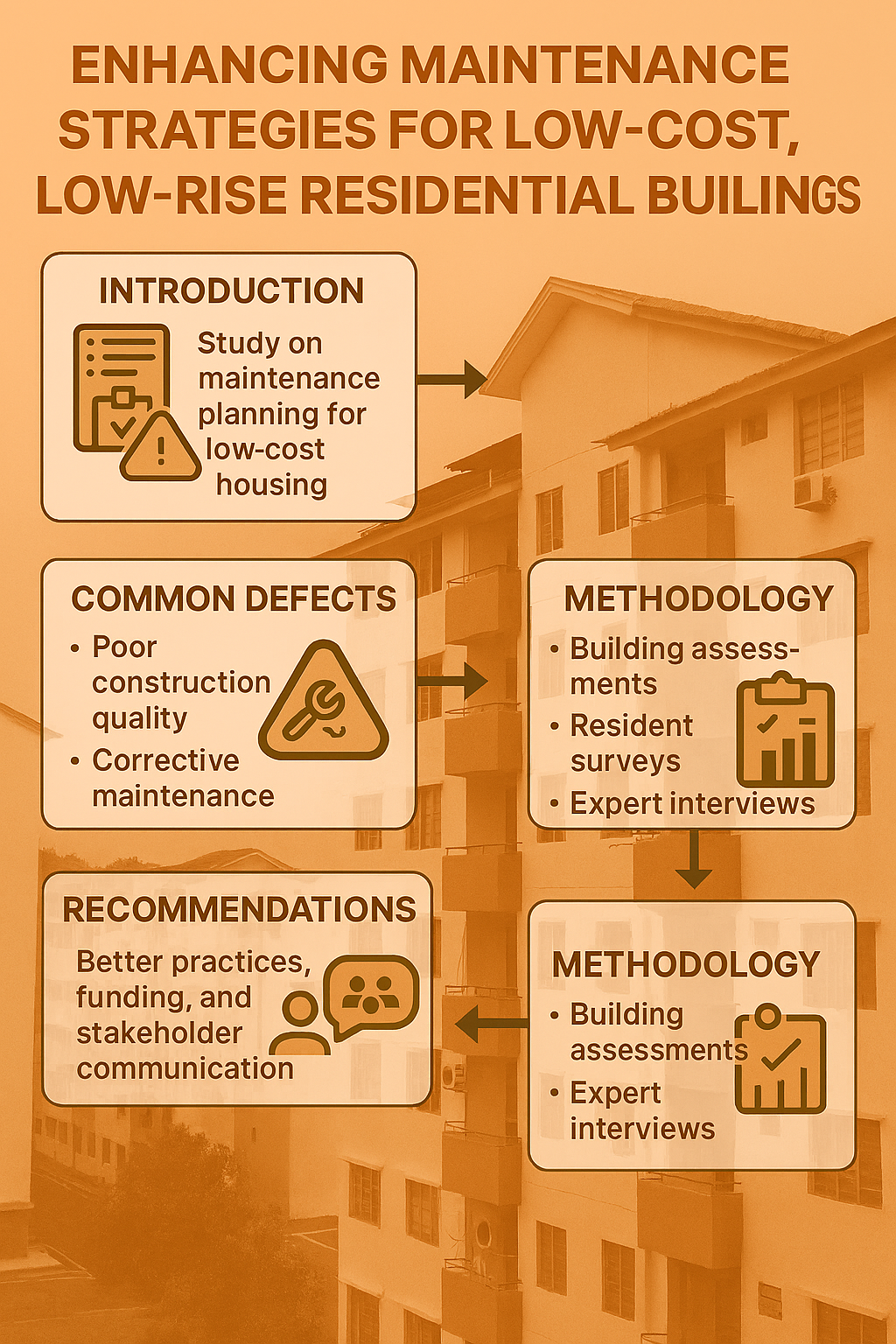 This research focuses on improving maintenance strategies for Malaysia's low-cost, low-rise residential buildings. Challenges include poor construction quality, reliance on corrective maintenance, and insufficient financial resources due to inefficient fee collection. These issues increase breakdowns, higher costs, and reduced building performance. The study aims to enhance the appropriate building maintenance planning in low-cost, low-rise residential buildings by assessing building conditions, identifying challenges, and recommending solutions. A mixed-method approach involves building condition assessments, resident and management surveys, and expert interviews to gather comprehensive insights. The findings will emphasise the importance of better construction practices, adequate funding, and improved stakeholder communication to ensure effective maintenance.
